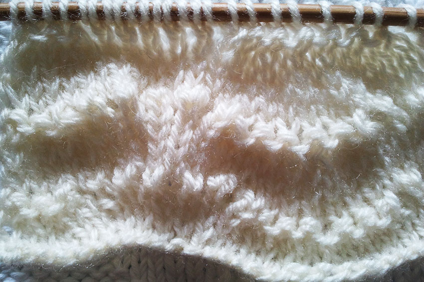 Hoy quiero mostrarles el Punto de Olas, que forma ondas en los bordes (así que no tendríamos que rematar los bordes haciendo picos, por ejemplo), y es muchísimo más fácil de lo que parece, menos mal…El dibujo se forma en tan sólo cinco vueltas, cuatro de las cuales se tejen del derecho y del revés, así que en realidad, es una sola la vuelta en la que tenemos que contar un poco, para no equivocarnos, pero en resumidas cuentas, es muy muy sencillo.