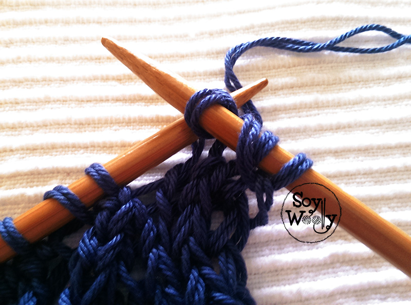 Haces la lazada (simplemente pasas el hilo por delante), deslizas 1 punto sin tejer a la otra aguja, y tejes 1 punto del derecho.